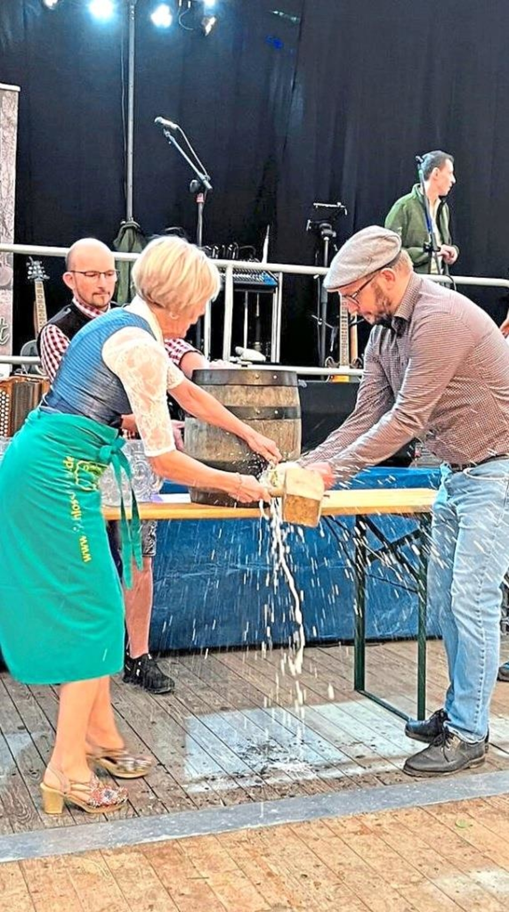 Der Bieranstich von Schirmherrin Gaby Wittenzellner wurde eine nasse Angelegenheit. −F.: Deiser