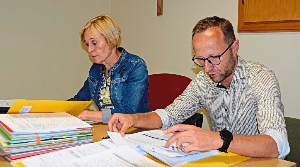 Den Haushaltsplan im Blick: VG-Kämmerer Andreas Mühlbauer mit Bürgermeisterin Gaby Wittenzellner.