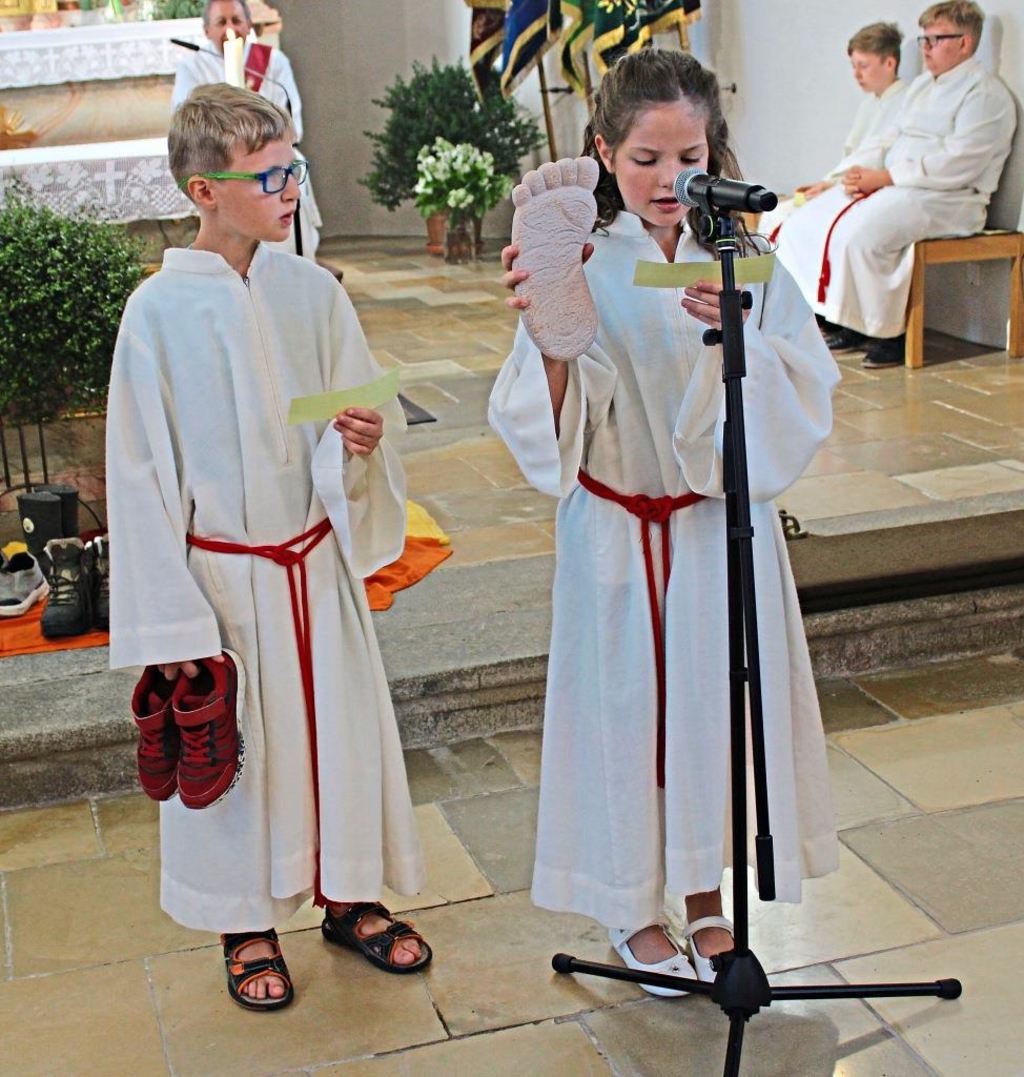 Die Ministranten brachten mit verschiedenen Schuhen das Kommen und Gehen auf den Punkt. Die Turnschuhe erinnerten an schöne Freizeiten, die Arbeitsschuhe an die Arbeit in vielen Gruppenstunden und legten dabei dar, dass sie stolz seien, dabei einen Beitrag für die Gemeinschaft zu leisten. In Anlehnung an das Evangelium vom Sämann legte Gemeindereferentin Probst bei ihrer Predigt Stiefel dazu, die der Bauer trägt, wenn er aussät. Auch wenn mit gutem Weizen Unkraut komme, solle man das wachsen lassen im Vertrauen auf Gott, dass er alles zum Guten führe. So sei es auch beim Glauben, wir sollten den Spuren Jesu folgen.